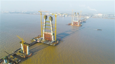 近日,在甬台温高速公路复线灵昆至阁巷段工程飞云江跨海特大桥南端工地上,记者通过无人机看到,在飞云江中央两座100多米高的索塔巍峨耸立,在索塔上端工作面上,工人正顶着海风在施工。据悉,两座索塔主体部分建设进入收尾阶段,桩基和水中承台施工也已完工,主桥、引桥墩身等一系列工程正在顺利推进。
