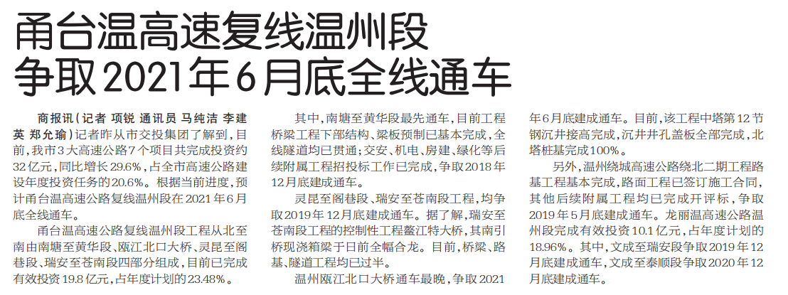 甬台温高速复线温州段争取2021年6月底全线通车