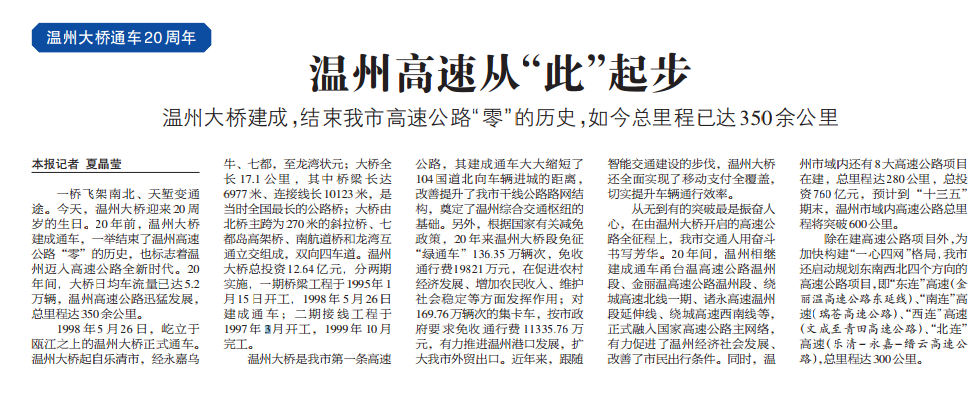 今天是温州大桥建成通车20周年