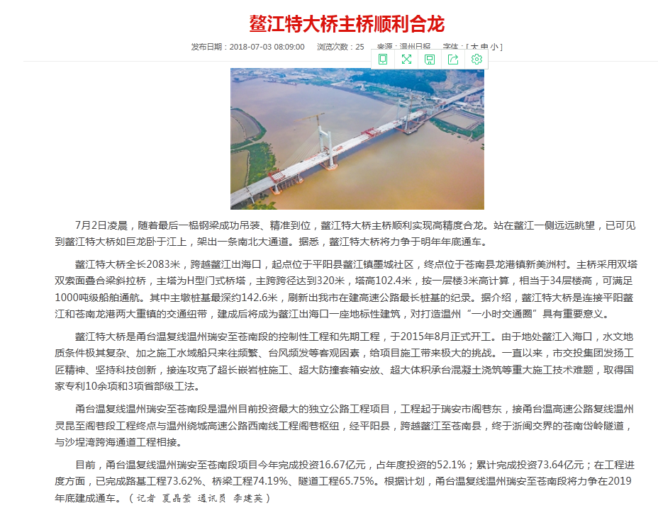 鳌江特大桥主桥顺利合龙