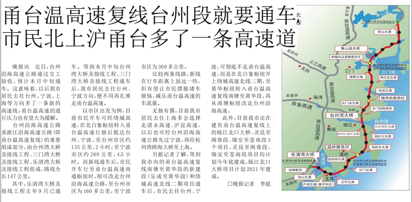 甬台温高速复线台州段本月中旬将通车——此去沪甬台多了一高速