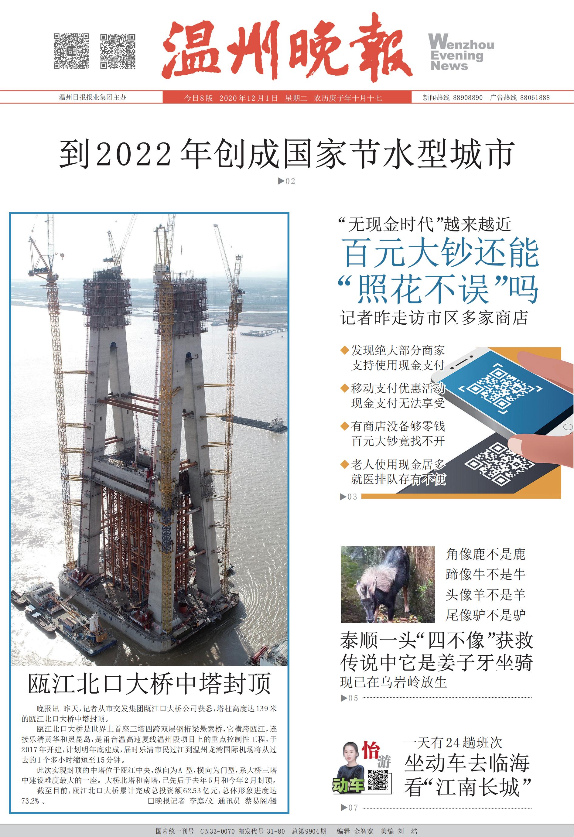 瓯江北口大桥中塔顺利封顶