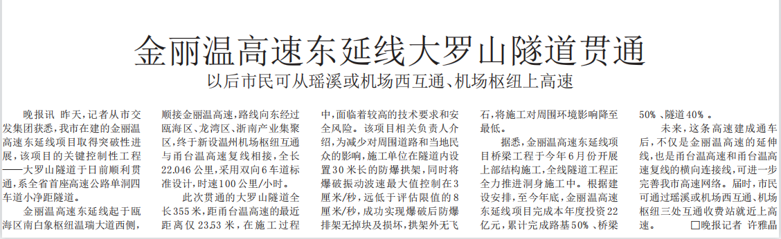 金丽温东延线控制性工程大罗山隧道顺利贯通