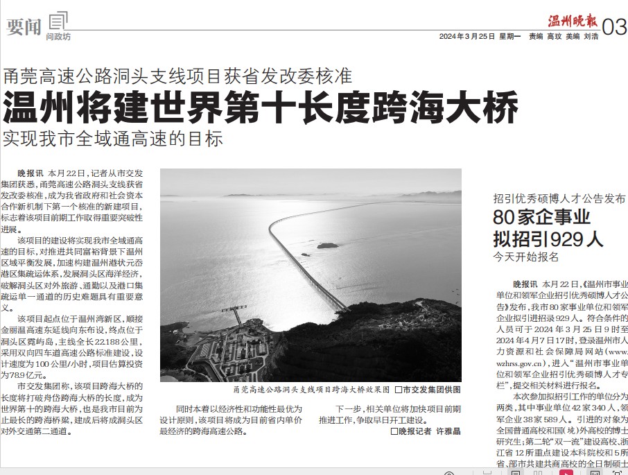 温州将建世界第十长度跨海大桥