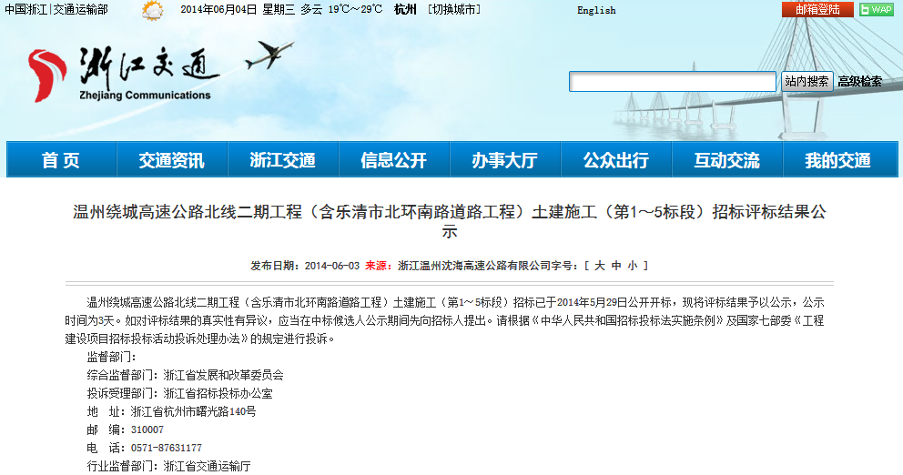 6月3日,温州绕城高速公路北线二期工程(含乐清北环南路工程)发布土建1-5标段施工中标公示,项目土建招投标工作进入最后流程。