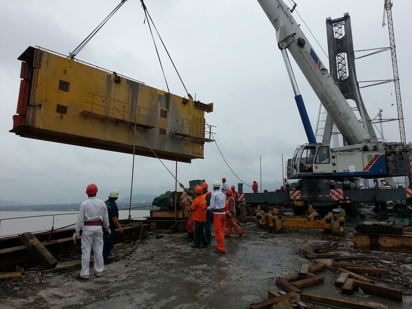 由温州监理公司监辖的大门大桥三标段,随着左幅在七月份的贯通,于8月15日完成对第2#移动模架拆除。至此,上部结构箱梁的左幅段第1#、2#移动模架皆顺利拆除完成。