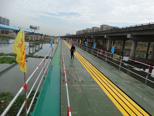 为确保顺利完成首座便桥,项目部作了充分的施工技术准备。施工前进行了专题图纸会审,围绕便桥施工的关键工序、质量控制要点、安全防护措施等内容对现场技术人员和作业班组进行了详细技术安全交底。在便桥施工过程中,项目部技术人员对桩位定位、桩顶标高、贝雷梁安装、栏杆安装、变形观测点设置等方面进行全过程控制,并及时组织了专项检查和验收。