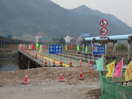 银溪河便桥长108米,宽6米,主体承重采用三组双拼六榀贝雷梁,全桥用钢量达330吨。该桥按60吨荷载设计,最大载重量可达90吨,满足施工期间所有载重车辆、机械的通行要求。