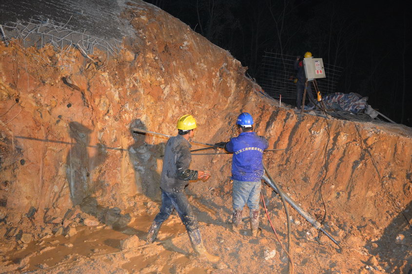 据悉,为了保证太平山2#隧道右线能安全进洞,形成“大干快上”的建设局面,第5标段“进度、质量、安全”三管齐下,昼夜作战,采取“浅刷坡,快支护”(即边仰坡刷坡时刷坡深度不能过大)的施工措施,既能保证汽腿式凿岩机汽腿支撑于工作平台时,与边仰坡岩面成形成90°的角度,又不致使开挖出的边坡暴露时间过长,保证边仰坡的稳定。