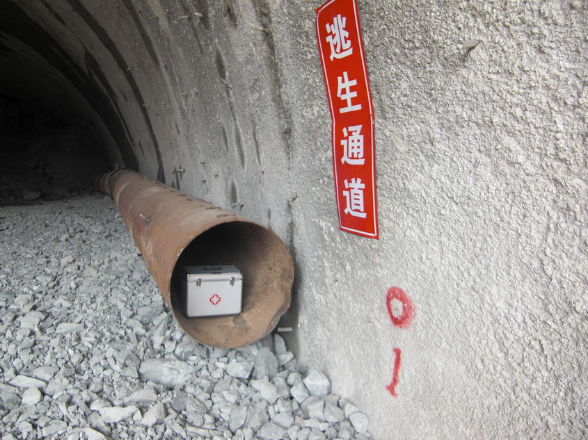 隧道应急逃生通道设置在隧道开挖掌子面与二次衬砌之间,随着开挖进尺的不断前移,需保证逃生通道距离开挖掌子面不大于20m,逃生通道采用孔径1m、壁厚大于6mm的钢管,最大程度保证通道的刚度、强度及抗冲击能力。管道沿着初期支护的一侧向掌子面铺设,掌子面同时放置应急食物箱和救护箱,应急食物箱可存放近10人一天所需的方便面、饼干、矿泉水等食物,救护箱内备有包扎纱布、消毒药水、常见外伤用药等,管内预留工作绳,方便逃生、抢险、联络以及传输各种药品。与此同时,结合目前隧道施工现场实际情况,对施工单位隧道施工人员加强安全教育培训,定期开展隧道应急演练,确保隧道施工人员能够正确使用逃生通道。