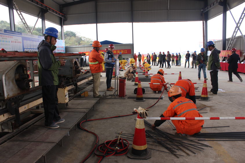 上午9时,各标段技术能手齐聚赛场,展开角逐。气焊工赛场上,选手们个个聚精会神,技术娴熟,焊接作业点上火花四溅,一派紧张气氛,操作结束后,评委们从外观质量、操作时间、安全生产、文明施工等多方面进行细致评判;钢筋工赛区,选手们耗时35分钟左右完成了钢筋绑扎任务,评委校验审核后,从钢筋选取、钢筋间距、扎丝绑扎情况等方面进行了打分。通过激烈比拼,来自第5段的气焊工郝春利、第8标段的钢筋工陈玉昌以精湛的技术、优异的成绩各自取得第一的佳绩。