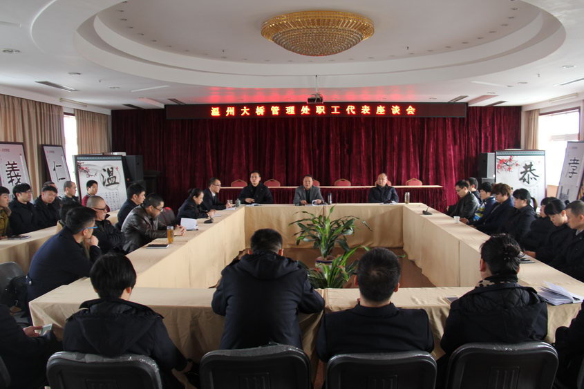 1月14日上午,大桥管理处在处五楼会议室召开职工代表座谈会,认真听取职工代表对管理处工作的意见和建议。大桥管理处主任戴新荣、副主任李诩、叶克钧及各科室负责人、职工代表共40余人参加会议。