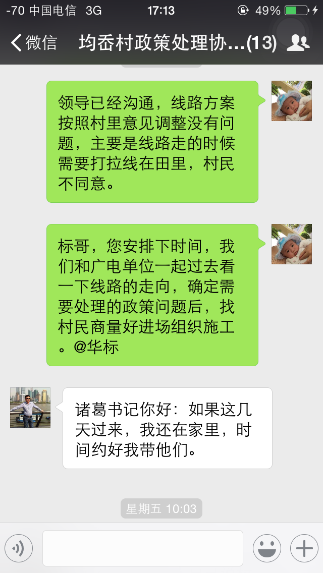 这是绕西南工程6标项目现场技术员李法利与地方村委在政策处理微信群里的对话,群里共享了现场已经处理完成的照片,实时发布了问题的解决情况。