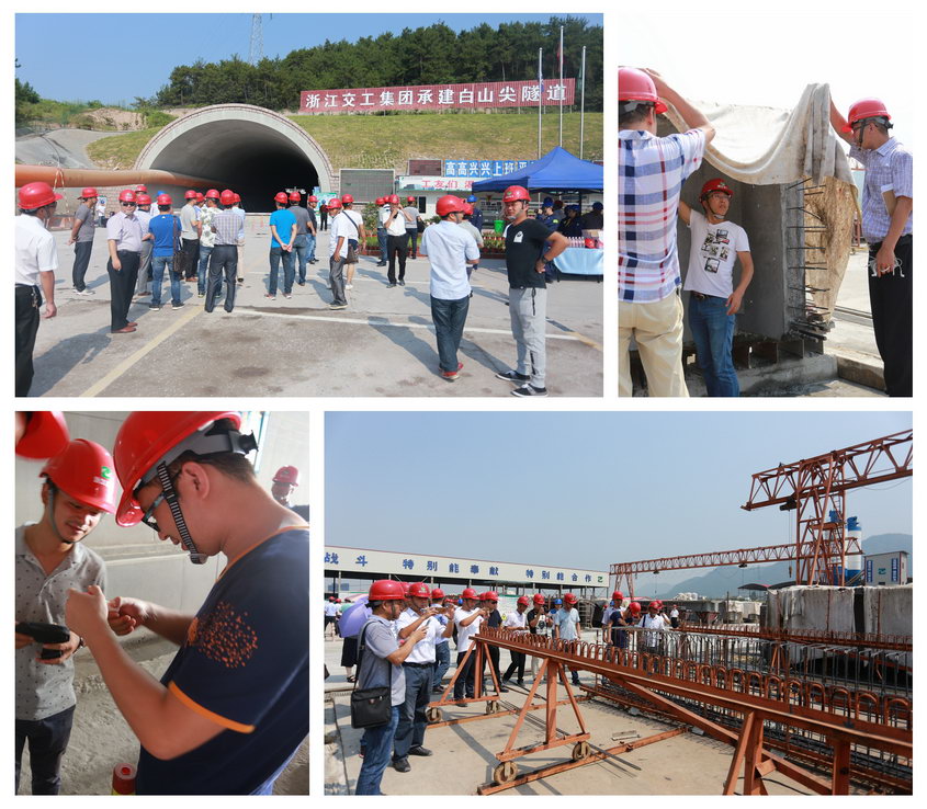 施工现场,考察组一行听取了项目施工方浙江交工集团技术人员对于疏港高速整体工程概况、工程进展情况、主要做法和施工重难点等方面的介绍,观看了隧道施工图片展板,并深入白云尖隧道施工现场实地参观。考察途中,每逢重点部位,考察组人员纷纷驻足拍照观看,并就隧道混凝土浇筑方法、钢筋施工工艺、隧道施工工序以及复杂地质条件下,项目部采取的系列安全防范措施等关注问题向现场施工管理人员详细询问。此后,考察团一行还重点参观了钢筋加工场、梁板预制场、混凝土拌合站等地的标准化建设。