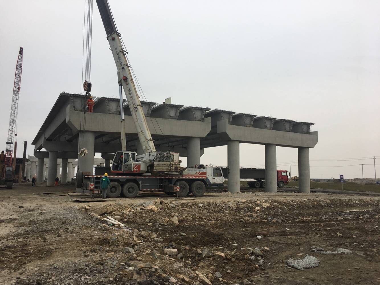 土建2标全线共730片预制箱梁,首跨预制箱梁在77#-78#墩,单片梁重约93.6吨。为确保本次吊装作业顺利,项目部充分做好准备工作,制定详细的吊装作业方案,及时组织召开技术交底会,加强各方协调和现场管理,明确现场施工人员职责分工,成功克服了施工场地上的困难,整个吊装过程安全、顺利、有序。