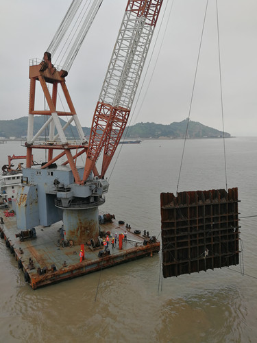 瓯江北口大桥中塔沉井属国内首次在深厚淤泥质土中建造超大型沉井基础,现中铁大桥局施工技术含量非常高,除了钢沉井自重大、就位下沉难的问题外,还需要克服“强潮、软土、台风”三大不利因素挑战。本次注水着床对加快沉井施工进度,早日部署度台防汛措施,减小施工风险具有积极意义。