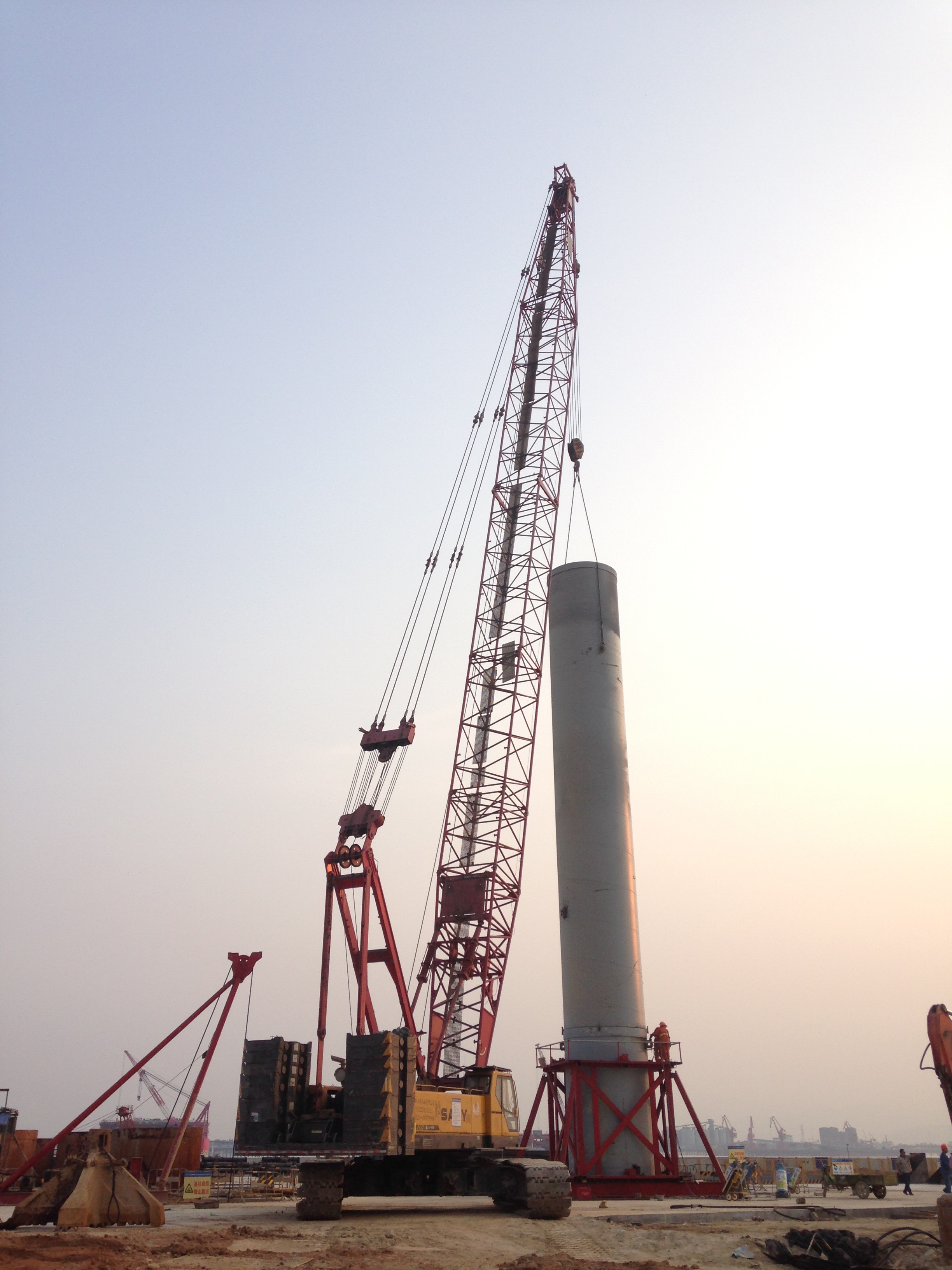 北塔基础设计采用群桩基础方案,采用30根D3.2m-D3.0m变直径钻孔灌注桩基础,永久钢护筒设计内径3.2m,壁厚24mm,长39.5m,顶标高-0.5m,底标高-40m,采用履带吊及振动锤进行振动沉桩。