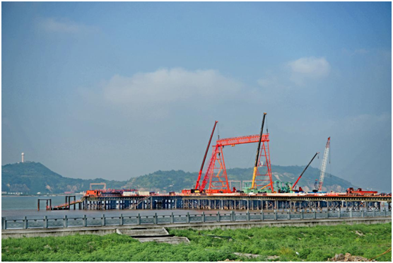 龙门吊主要用于南塔桩基钻孔设备吊装和桩基钢筋笼下放工作,是确保瓯江北口大桥南塔桩基顺利推进的重要基础设备。