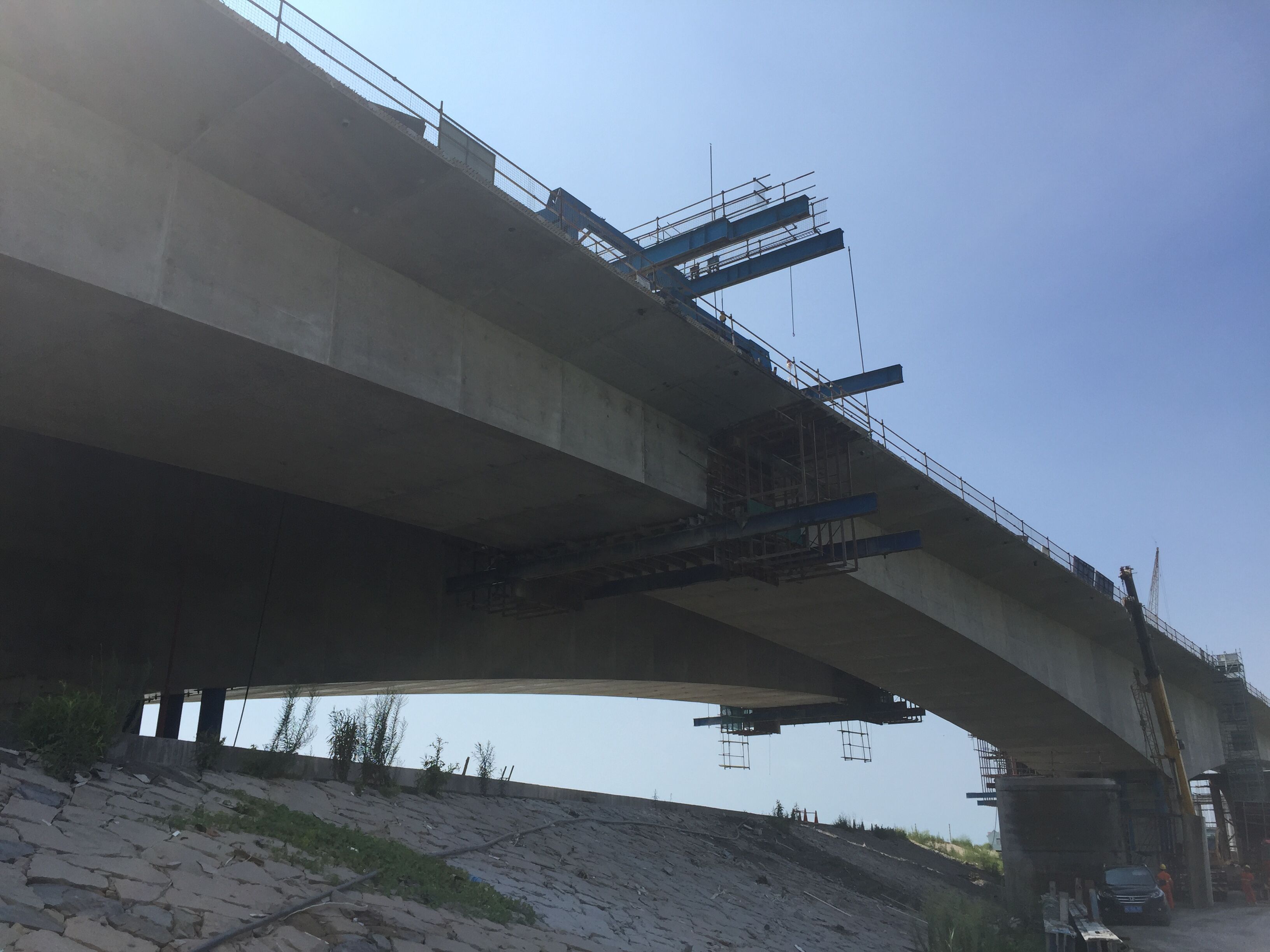本次施工的连续梁位于103-106墩,结构形式为75+135+75米预应力混凝土连续梁,这是工程全线跨径最大的现浇箱梁。由于地处沿海,气候条件复杂,夏季台风频繁,且需上跨堤坝施工,挂篮难度不小,为保证本次挂篮施工顺利进行,项目部多线出击,精心组织施工,科学有序安排,强化风险控制,狠抓过程控制,紧紧围绕安全、质量、进度等指标,全面推进规范施工,确保挂篮施工节点工作按期、保质、保量完成。