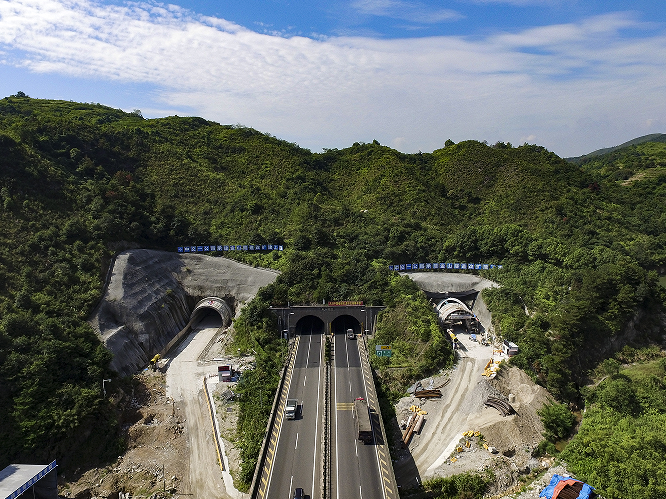 金山隧道左线全长465.42米,隧道拓宽采用两侧各新建一座二车道隧道的形式,既有隧道利用维持不变,新建隧道与既有隧道最小间距仅为25米。