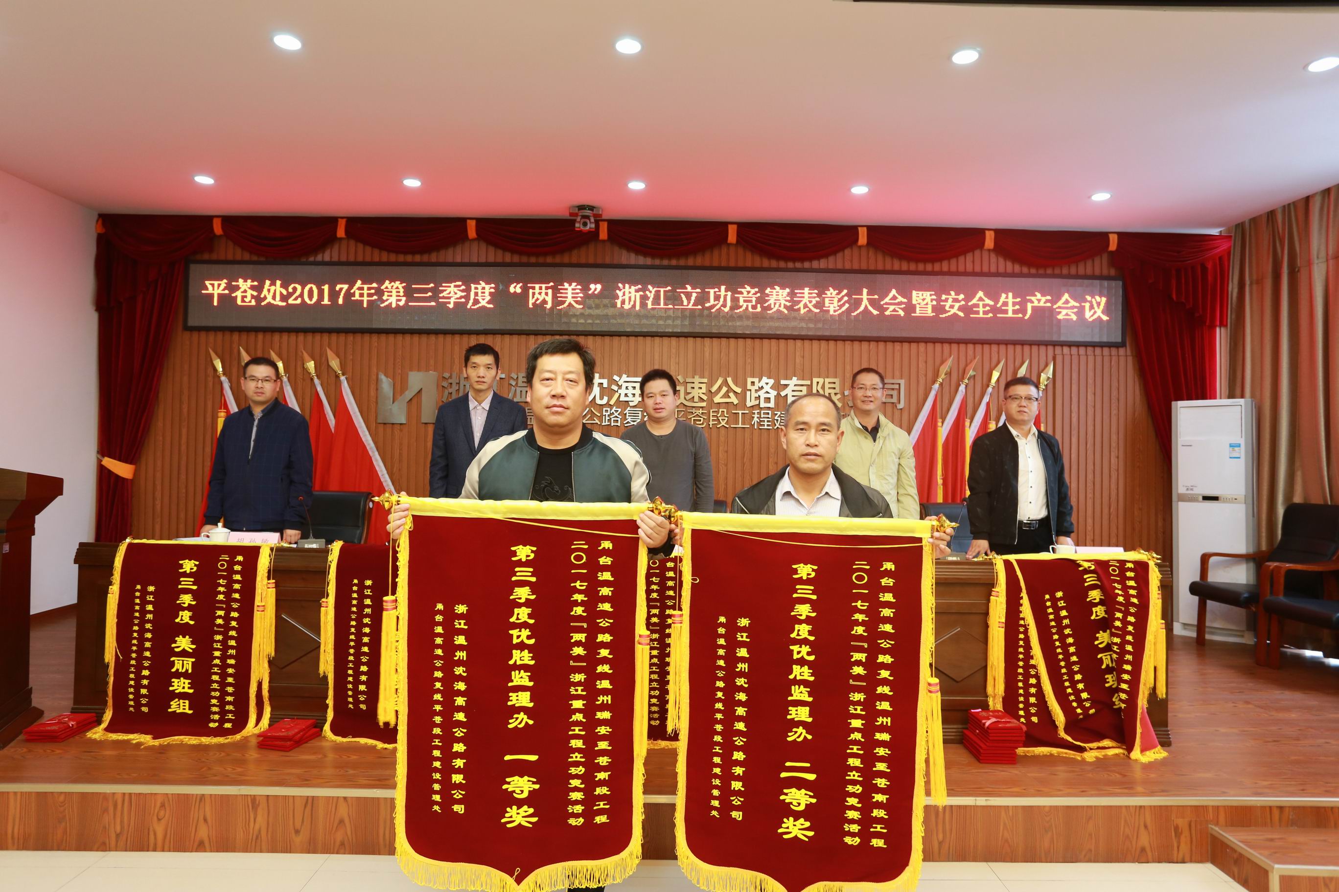 为树立典型,表彰先进,进一步激发各参建单位参与立功竞赛活动的积极性,有效助力“两美”浙江活动创建,11月7日上午,沈海公司平苍处组织召开2017年第三季度“两美”浙江重点工程立功竞赛表彰大会暨安全生产会议。沈海公司总经理蔡邦国、总工姜玉龙,管理处各职能科室及施工、监理单位共计100余人参加会议。