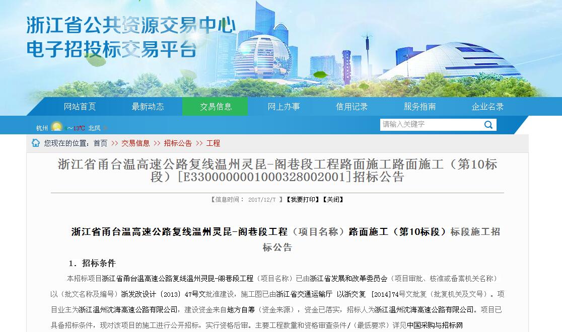 12月7日,甬台温高速公路复线温州灵昆-阁巷段项目在浙江省公共资源交易中心电子招投标交易平台、中国采购与招标网、浙江省招标投标网、浙江交通网发布路面施工招标公告,落实启动招标流程。