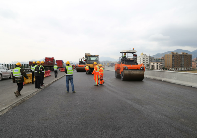 为了保证乐清高架桥原路的通行安全和摊铺施工需要,3标项目部前期沿路线外侧修筑临时施工便道,以及使用当地道路作为施工便道,确保满足现场机械设备的通行要求。同时,在原路面硬路肩处用水马进行隔离,分为原路通行区和摊铺施工区,施工中配备管理人员11名,作业人员52名,按排专人对施工车辆指挥,施工人员全部穿反光背心,保证施工安全。此次试验路段沥青摊铺的顺利完成,为后续路面施工的开展奠定了基础。