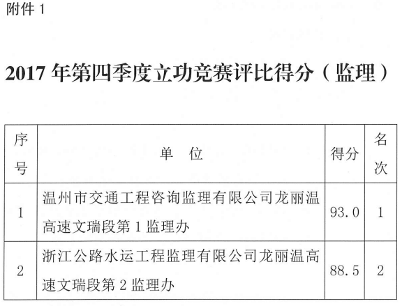 在龙丽温文瑞项目指挥部组织开展的2017年第四季度立功竞赛评比活动中,龙丽温高速公路文瑞段工程第一监理办以93分的成绩再次荣获第一名。至此,龙丽温文瑞第一监理办在2017年立功竞赛中囊括四个季度的全部冠军,喜获满堂红。