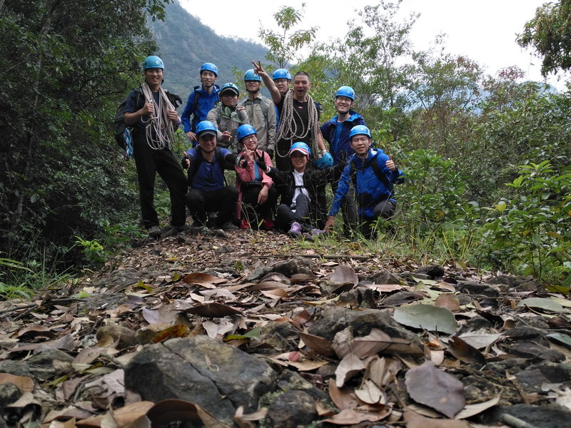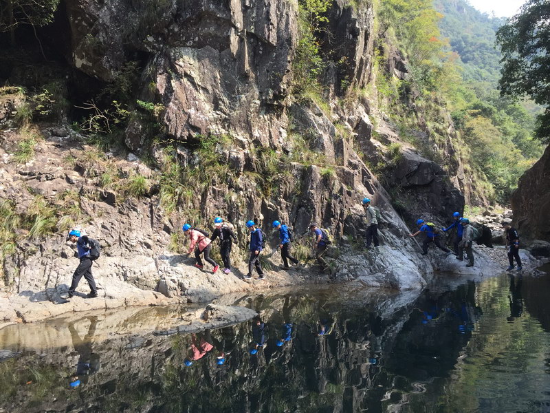 本次培训,集团应急救援队一行首先在永嘉鹤盛乡杨柳潭水库附近学习了如何正确使用指北针和等高线地形图等辅助工具进行方位识别和定向导航。随后救援队在桃树凹分成两支小组,以印第安式搜救队形从横潭出发向龙湾潭附近目的地前进。全体救援队员在峡谷丛林中负重前行数公里,时而在峡谷中溯溪而行,时而利用绳结技术在峭壁或丛林中上升下降。在中途休息期间,队员们相互实践了野外紧急止血和包扎科目。