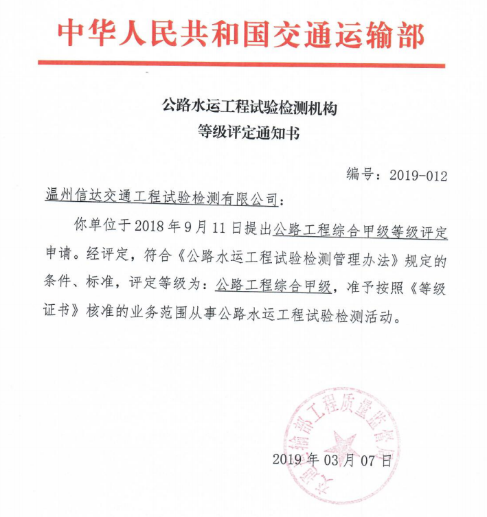 近日,在交通运输部工程质量监督局发布的《公路水运工程试验检测机构等级评定通知书》(编号2019—012)中温州交投集团信达检测公司正式获批公路工程综合甲级资质,成为温州市首家获得此项资质的检测机构。