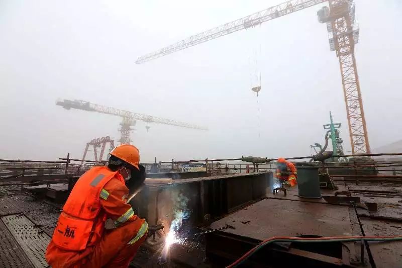 在瓯江北口大桥施工现场,电焊工人已经开始焊接工作,塔吊的吊装工作也在有序进行,手持遥控的工作人员正在吸泥机旁开展沉井清基的作业,现场施工有条不紊。