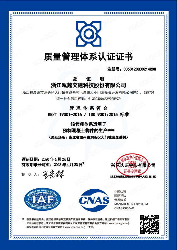 该证书的取得标志着浙瓯交建科技公司质量管理体系符合装配式预制构件质量管理体系的标准及相关要求,具备相关领域工业化构件研发制造的能力,是公司产品走向市场化并与国际标准接轨的第一步。公司将以此为契机,不断提升质量管理水平,树立良好的企业形象和信誉,提高市场竞争力,以满足更多客户规定和潜在的要求。