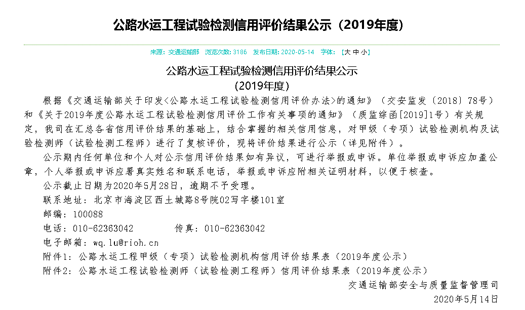 2020年5月14日,交通运输部安全与质量监督管理司公布了2019年度公路水运工程试验检测信用评价结果,信达公司荣获公路水运工程试验检测信用评价最高等级“AA”级。