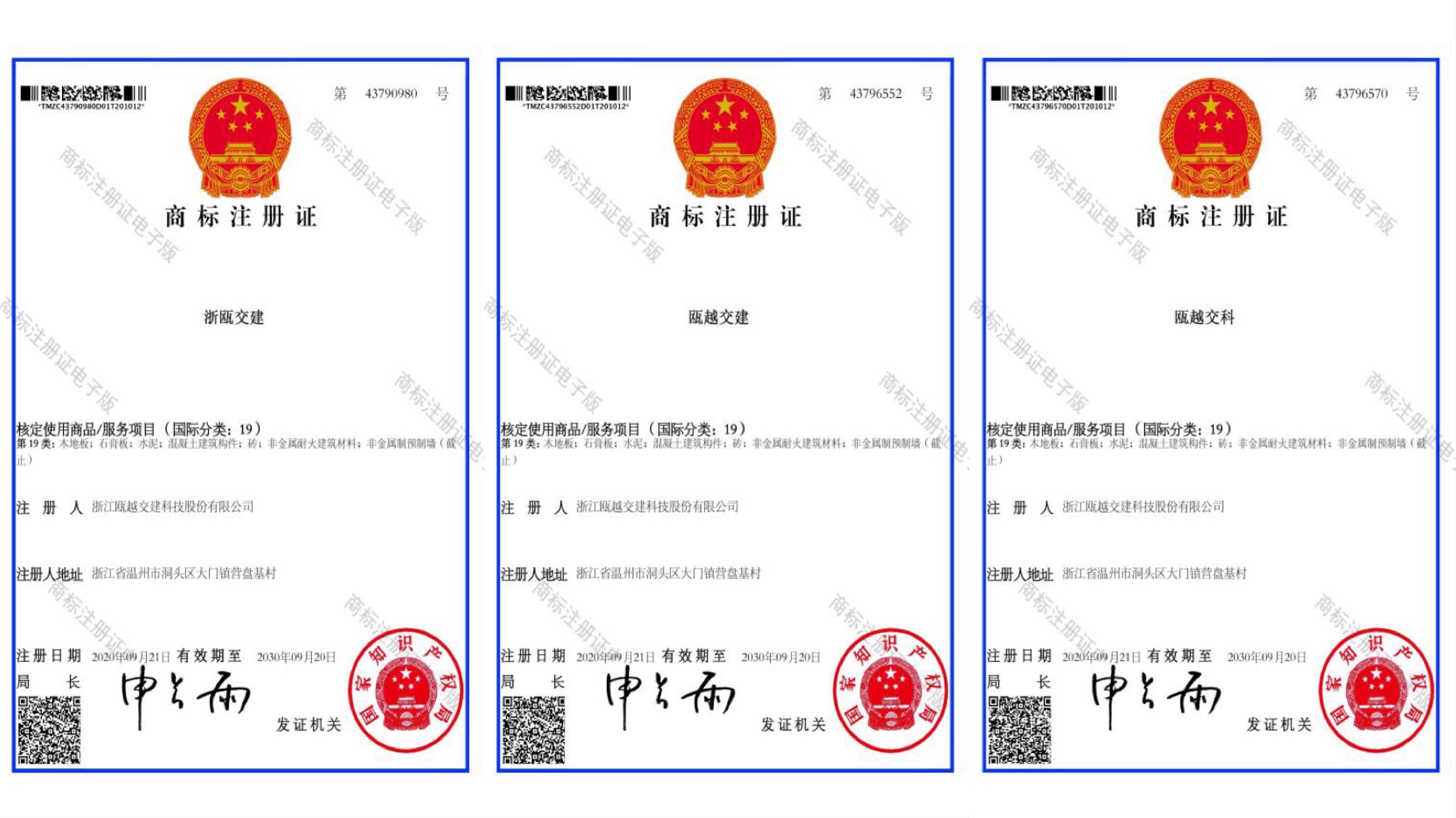 浙瓯交建科技公司成功取得国家商标注册证书