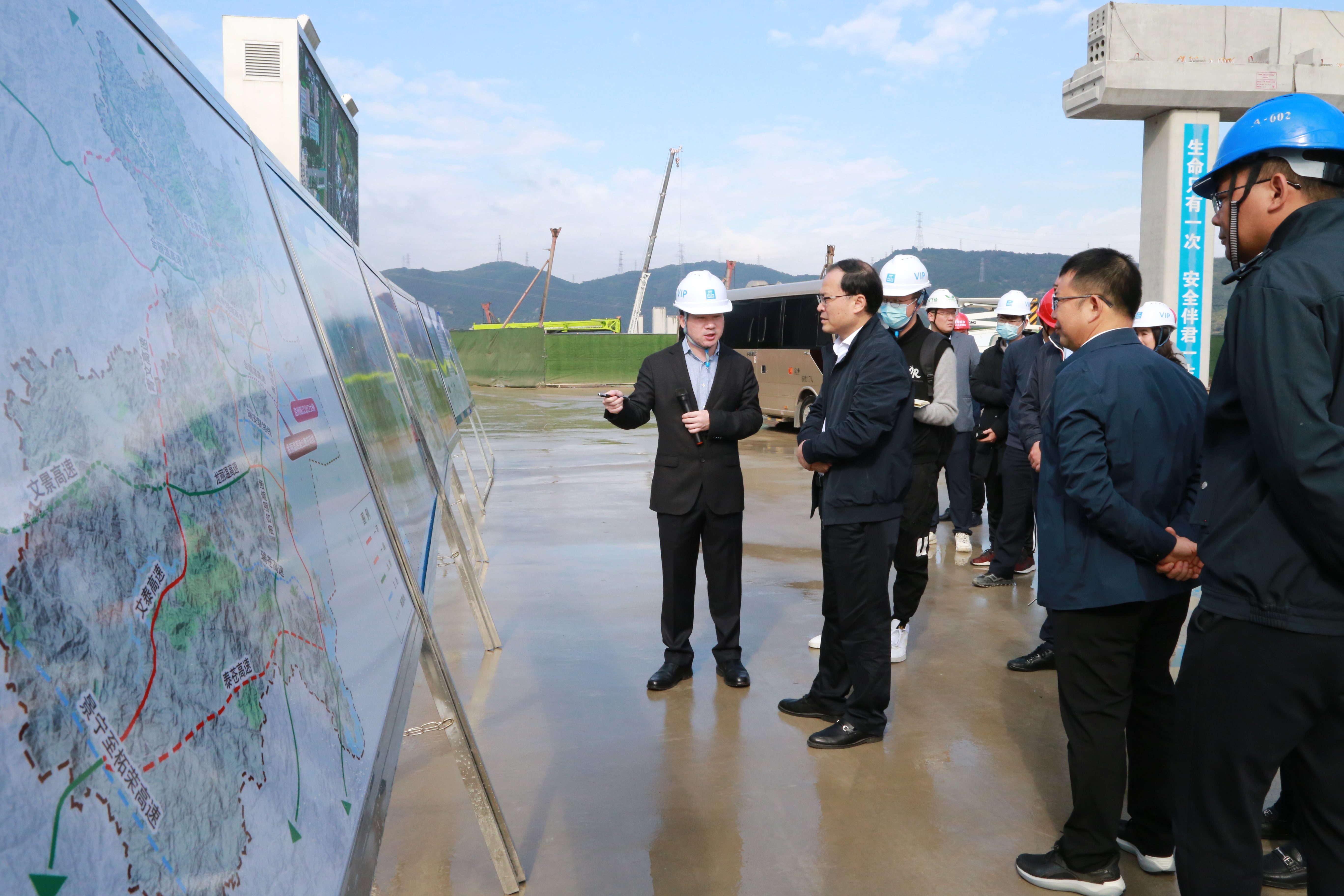 陈作荣一行人深入一线,实地察看了金丽温东延线瑶溪2号桥施工现场,并听取了关于项目工程建设概况、项目特点、建设进度及下步计划的汇报,对工程建设各方面给予肯定。