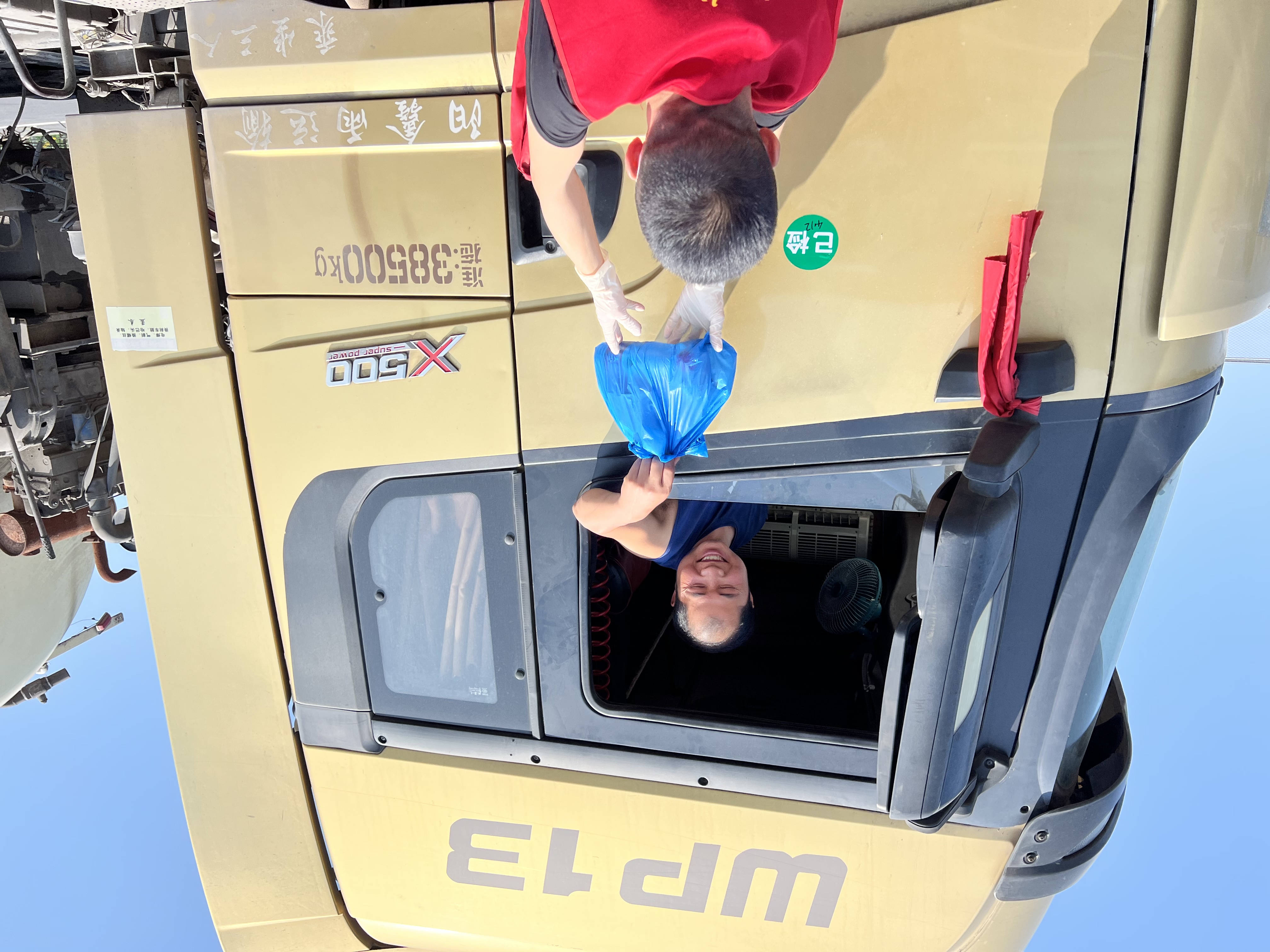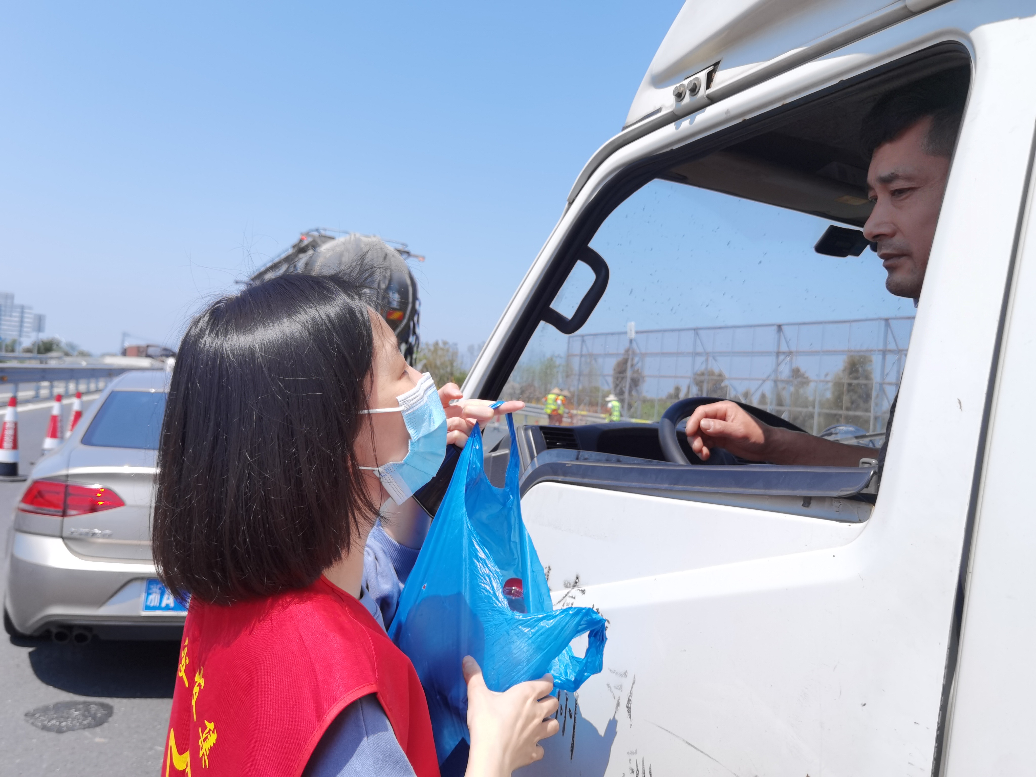 针对过往的货车师傅们在高速公路连续行驶数个小时,饮食、休息不方便的情况,瓯江口大桥公司的志愿者们从早上到天黑连续9个小时在灵昆收费站的核酸检点为来往的司机师傅们分发免费的水、餐食、点心、湿巾等爱心物品。