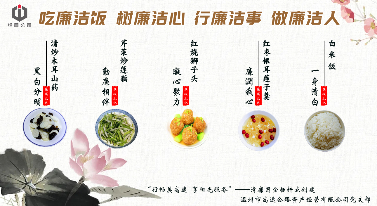 共进一次“廉洁”工作餐。党支部积极谋划、精心设计,结合廉政寓意特制黑白分明(山药炒木耳)、勤廉相伴(清炒芹菜莲藕)、凝心聚力(红炒狮子头)、廉润我心(红枣莲子银耳汤)、一身清白(白米饭)五道“廉”菜佳肴,组织干部职工共享廉洁工作餐,提醒大家珍惜美好生活,时刻保持清醒,清清白白做人,干干净净做事。
