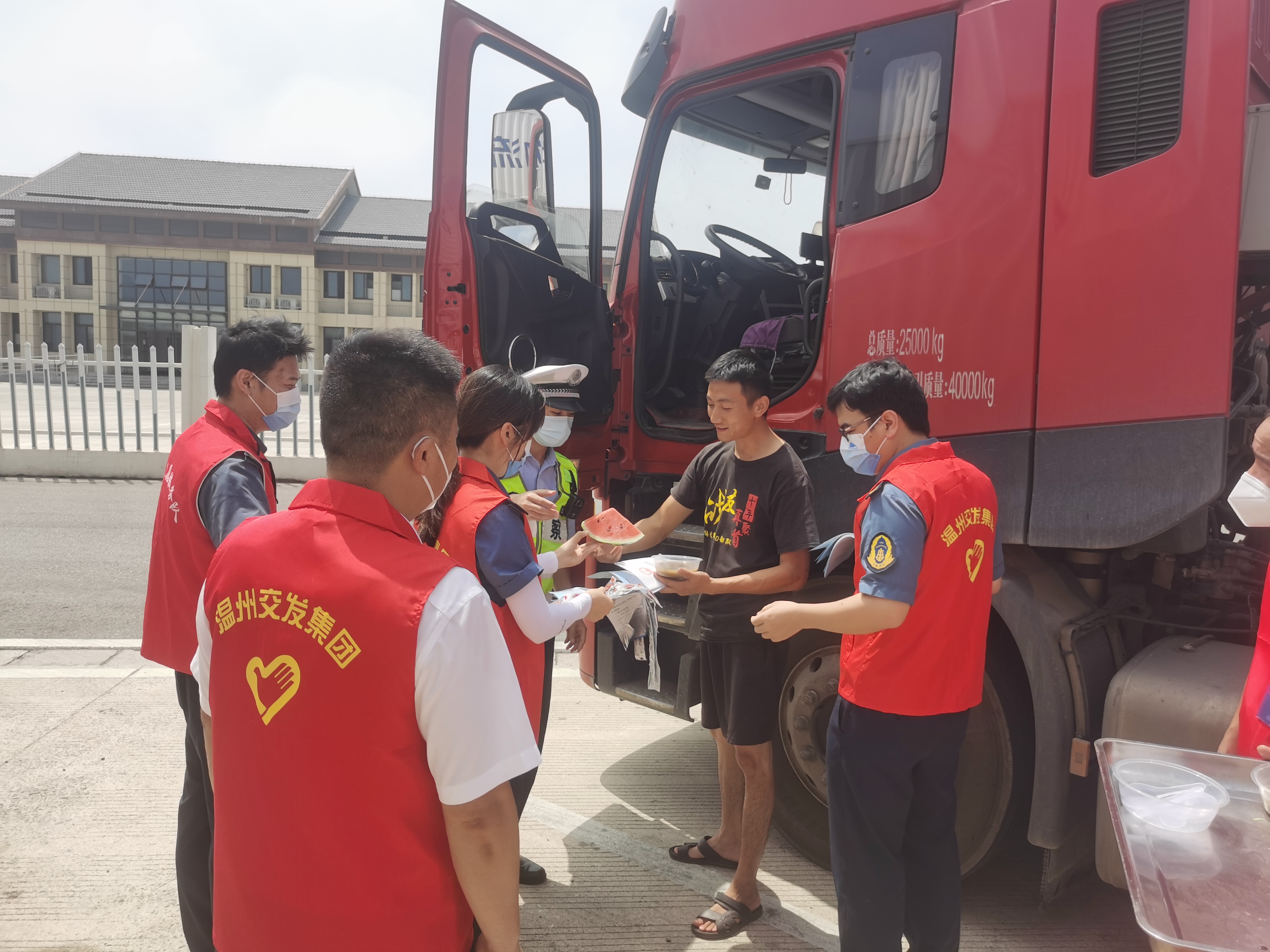 近日,持续的高温天气给长途奔波的货车司机行车安全带来一定影响,为切实做好对货车司机群体的关心关爱,切实营造更加贴心的服务环境,7月12日上午,瑞安服务区组织开展“红七月 夏日送清凉 平安行高速”服务活动,温州高速交警五大队、温州高速执法一大队二中队、瑞安服务区工作人员参与。