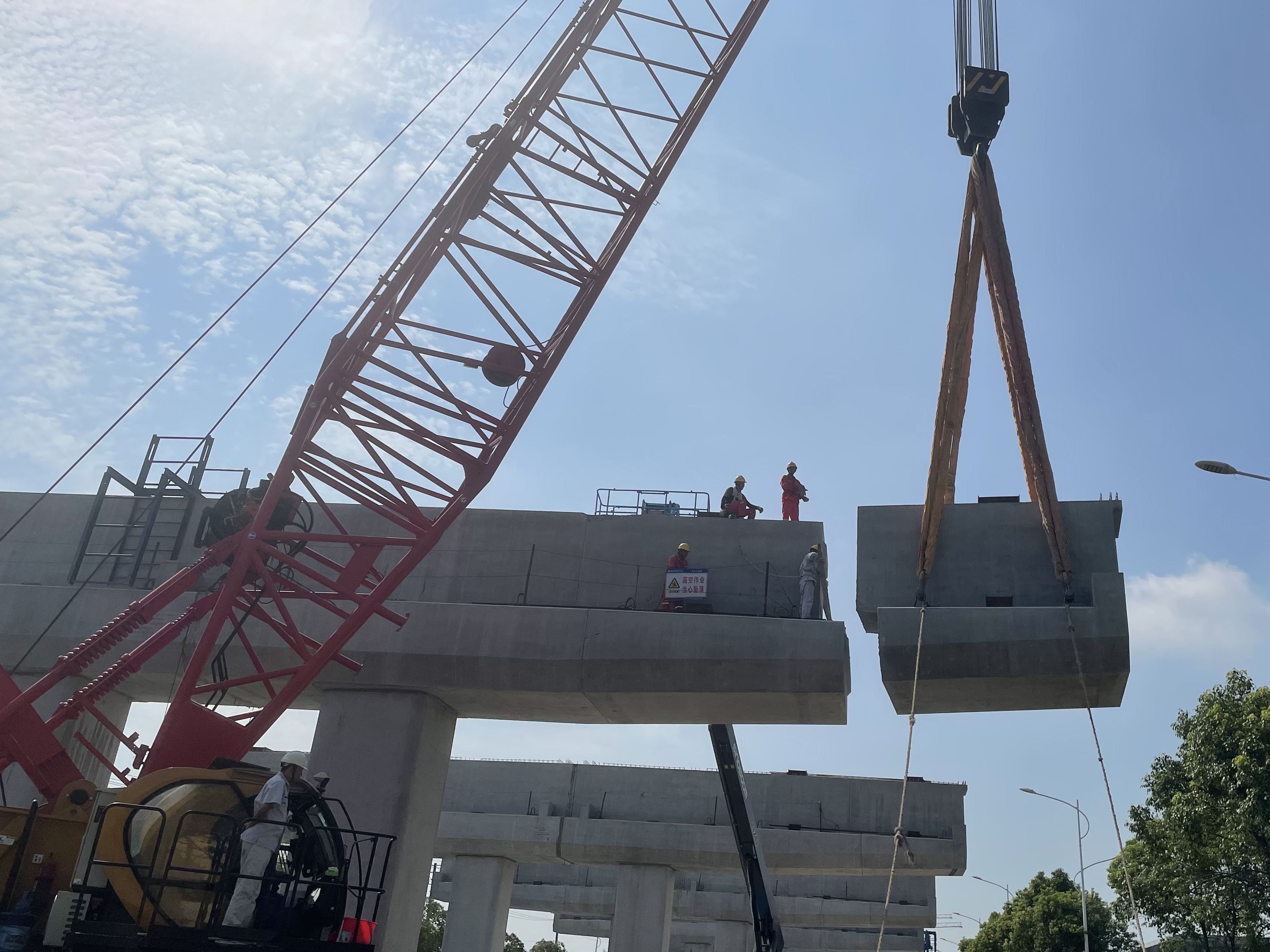 该标段预制盖梁安装共66道,每道预制盖梁分为6个节段,其中最重节段约140吨。由于预制盖梁体量重、吊装风险大、精度要求高,在历经300余天的安装施工中,为保证预制盖梁安装的质量安全,项目精心组织,不断优化吊装方案,调度专用作业机械设备,安排专人全程跟踪,确保现场施工安全,并通过落实调整安装对位措施,克服预应力孔道对位错位、相邻墩顶块波纹管安装、相邻预制盖梁之间T梁架梁空间等问题,保证了安装精度。