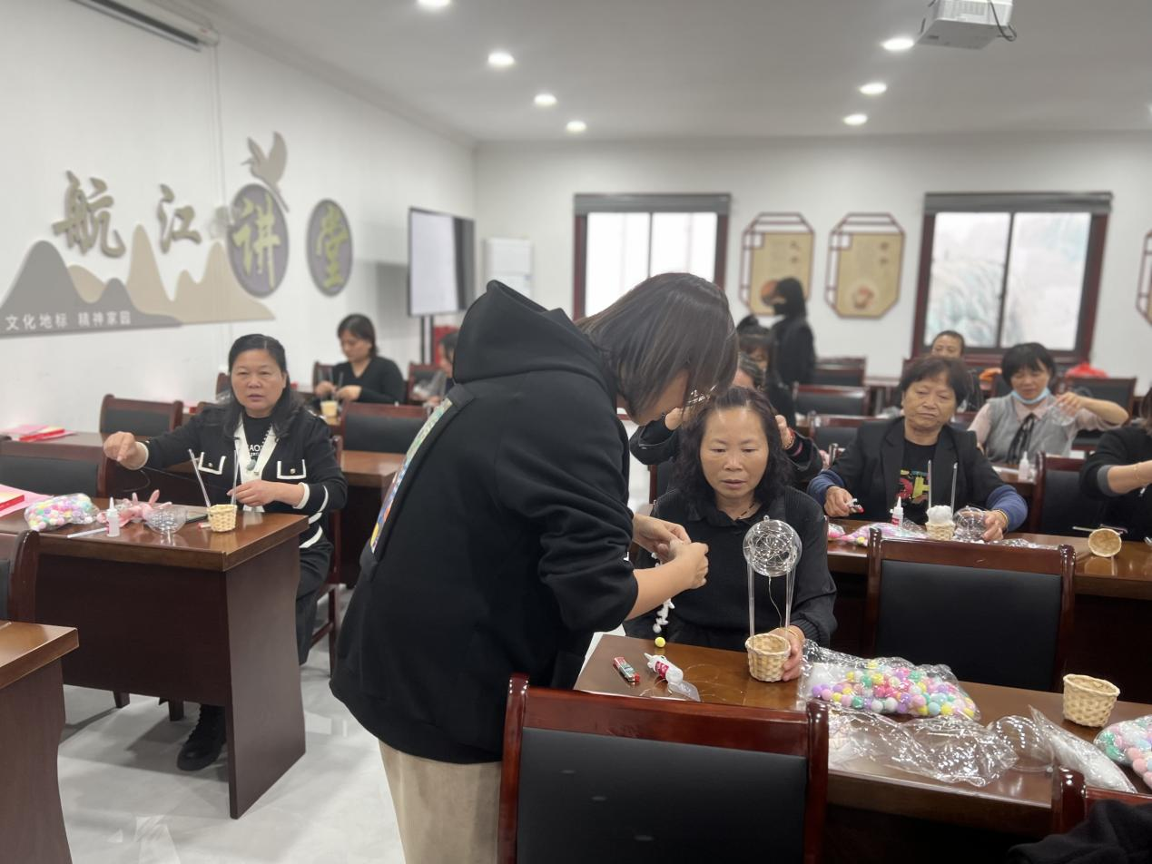 党群服务中心还邀请社区妇女群众参加热气球DIY活动。首先,手工老师向大家介绍此次妇女儿童权益保护法宣传教育活动意义,随后依次展示所需要的原材料和使用顺序,并带领着大家按照每一个步骤完成着:绕灯线、装灯球、粘封口等,制作出一个个五彩斑斓的热气球。在活动过程中,大家边制作边轻声讨论,互相帮助、互相合作,活动现场其乐融融。
