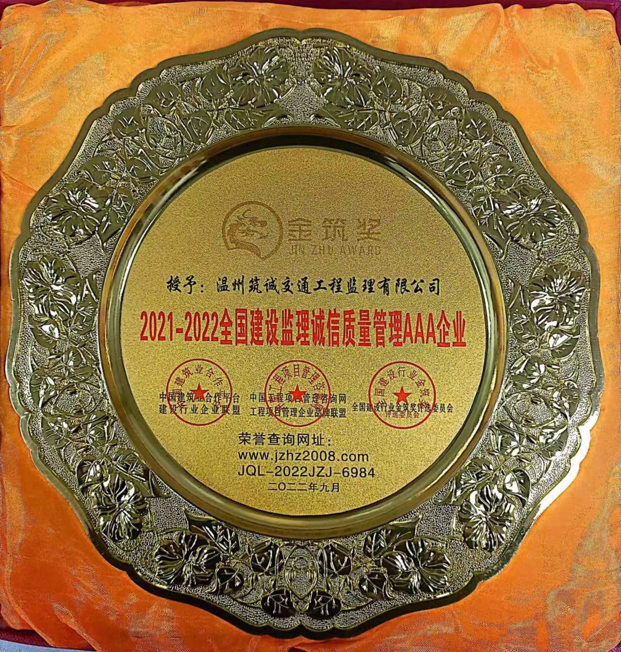 近日,第九届全国建设行业“金筑奖”评选结果出炉,诚达公司下属温州筑诚交通工程监理有限公司荣获“2021-2022全国建设监理诚信质量管理AAA企业”。