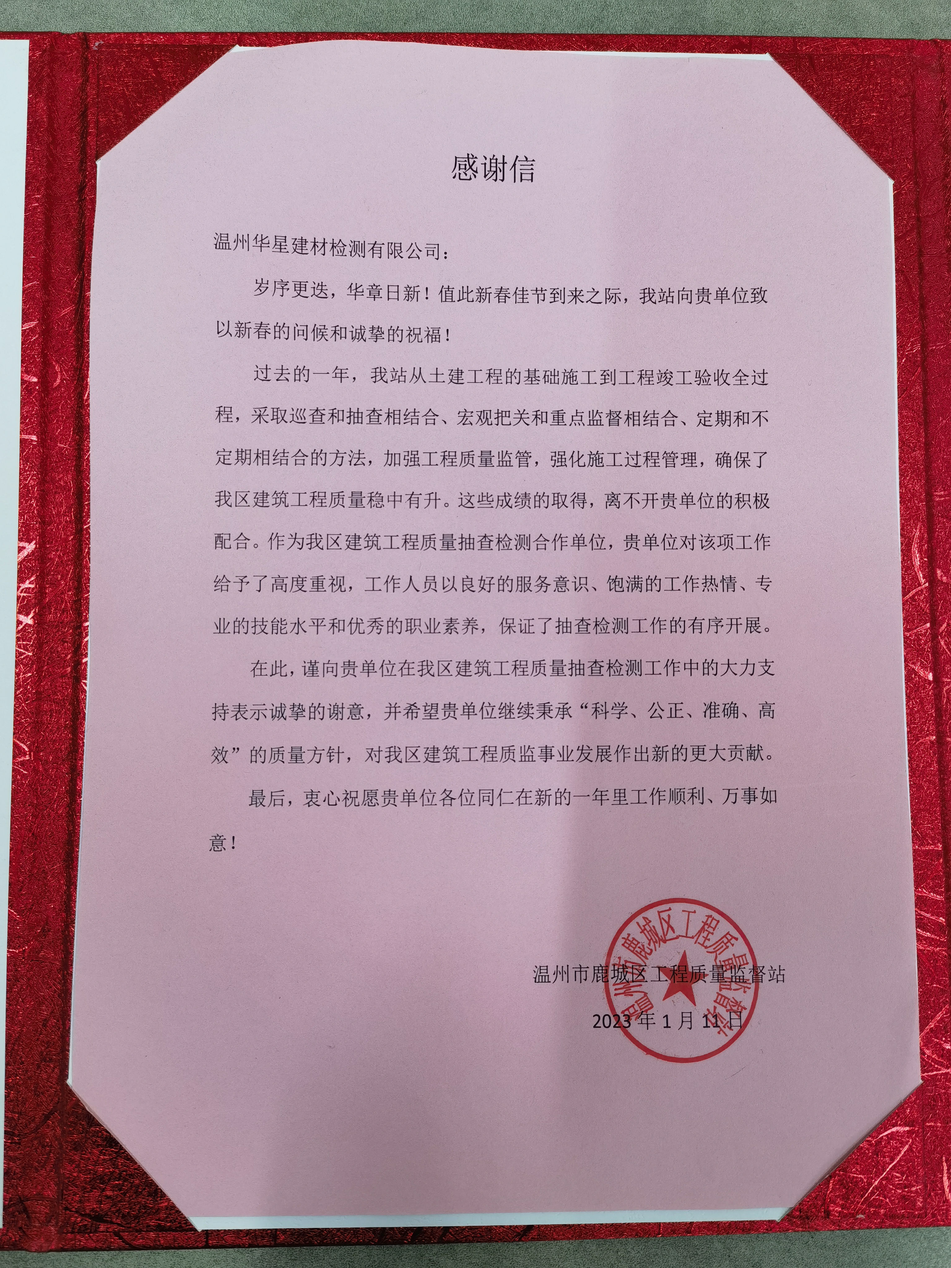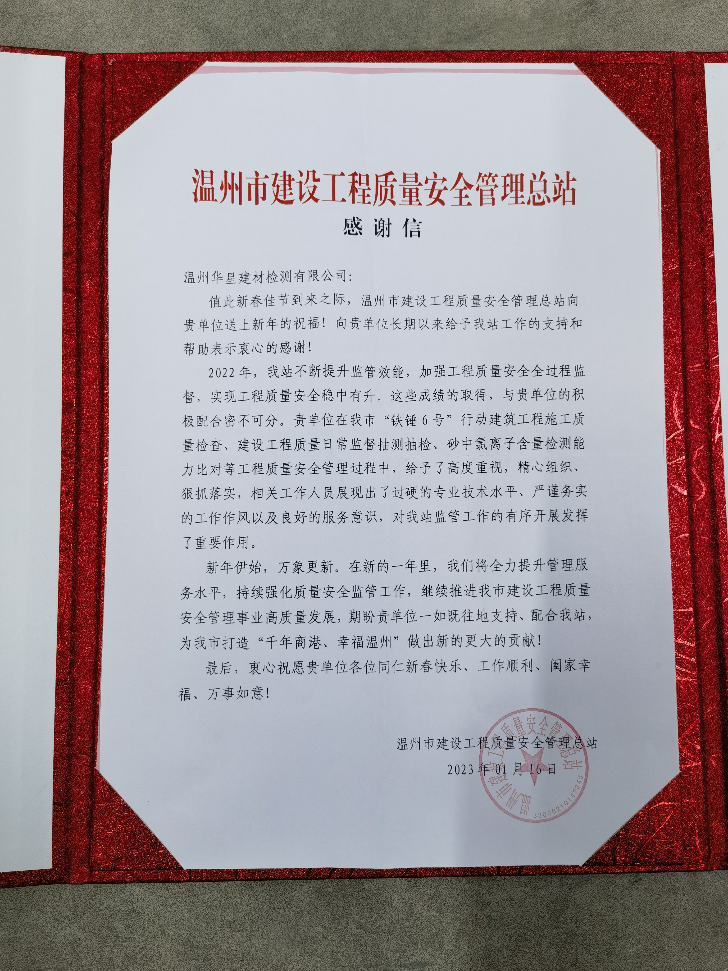 岁序常易,华章日新。连日来,诚达公司下属华星公司收到来自市建设工程质量安全管理总站和鹿城区工程质量监督站两份特殊的“新年礼”——感谢信。信中表示,感谢这一年来华星公司在我市“铁锤6号”行动建筑工程施工质量检查、建设工程质量日常监督抽测抽检、砂中氯离子含量检测能力比对等工程质量安全管理和鹿城区建筑工程质量抽查检测过程中,对市、区两级行业主管部门开展建筑工程质量安全监督执法检查行动的积极协助。同时,华星公司还全力配合市场监管局、市发改委、市住建局三部门开展预拌混凝土专项整治监督检查工作。华星公司履职尽责地为政府部门提供科学,公正的检测结果,得到上级部门的一致肯定。这两份感谢信既是对华星公司工作给以高度肯定和赞许,更是奋战一线的华星人辛勤付出,严谨务实的工作有力证明。