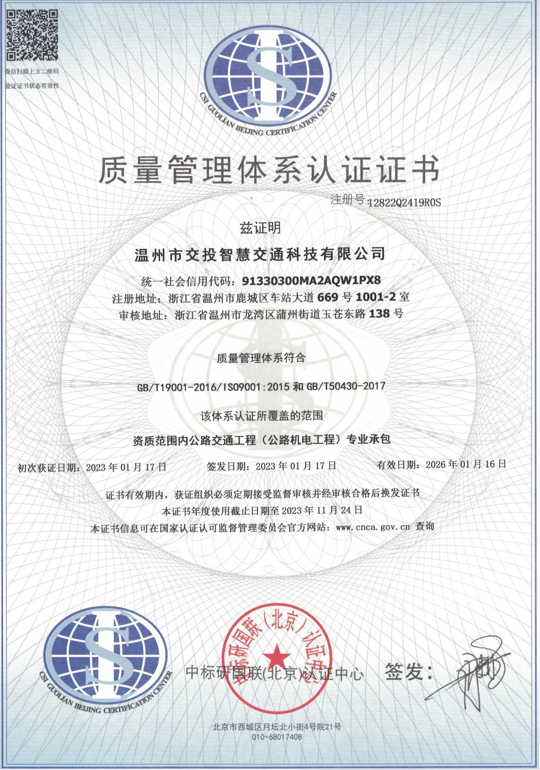 近日,温州市交投智慧交通科技有限公司顺利通过中标研国联(北京)认证中心的专项审核,正式获得质量管理体系、环境管理体系、职业健康安全管理体系“三体系”认证证书,这标志着温交科公司在精细化、规范化、标准化管理上迈上了新的台阶。