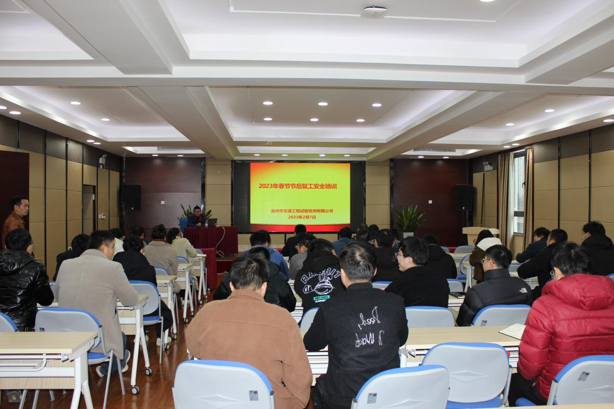 为确保春节后安全有序复工,持续提升全体员工安全意识,2月7日,诚达公司下属温州市交通工程试验检测有限公司开展2023年度春节节后复工安全培训,公司全体在岗干部职工参加。