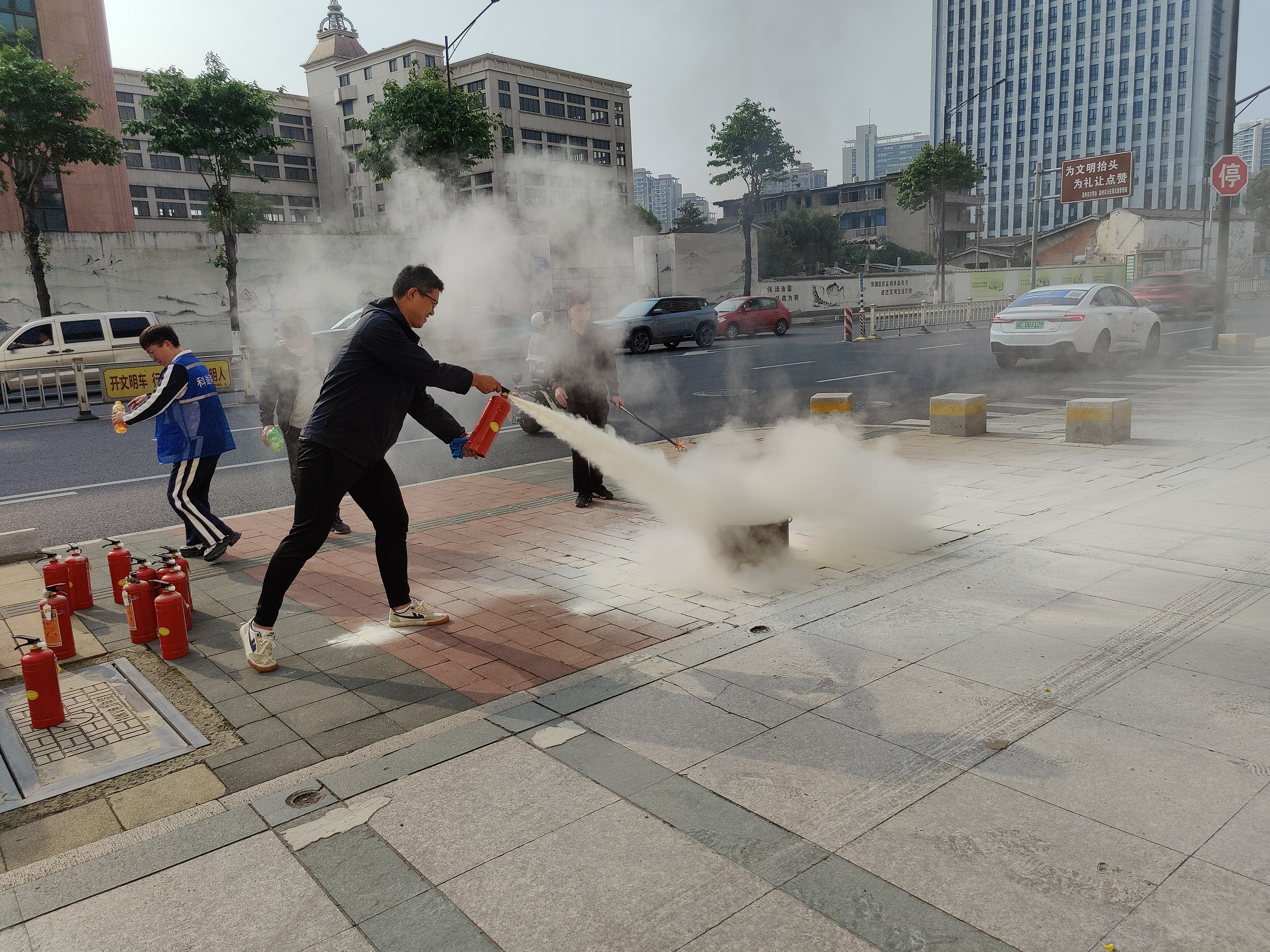 专业人员讲解灭火器的使用方法和注意事项后,全体员工积极参与,严格按照动作要领,拔下保险销,对准火焰根部,按下压把进行喷射,“稳、准、狠”扑灭火势。