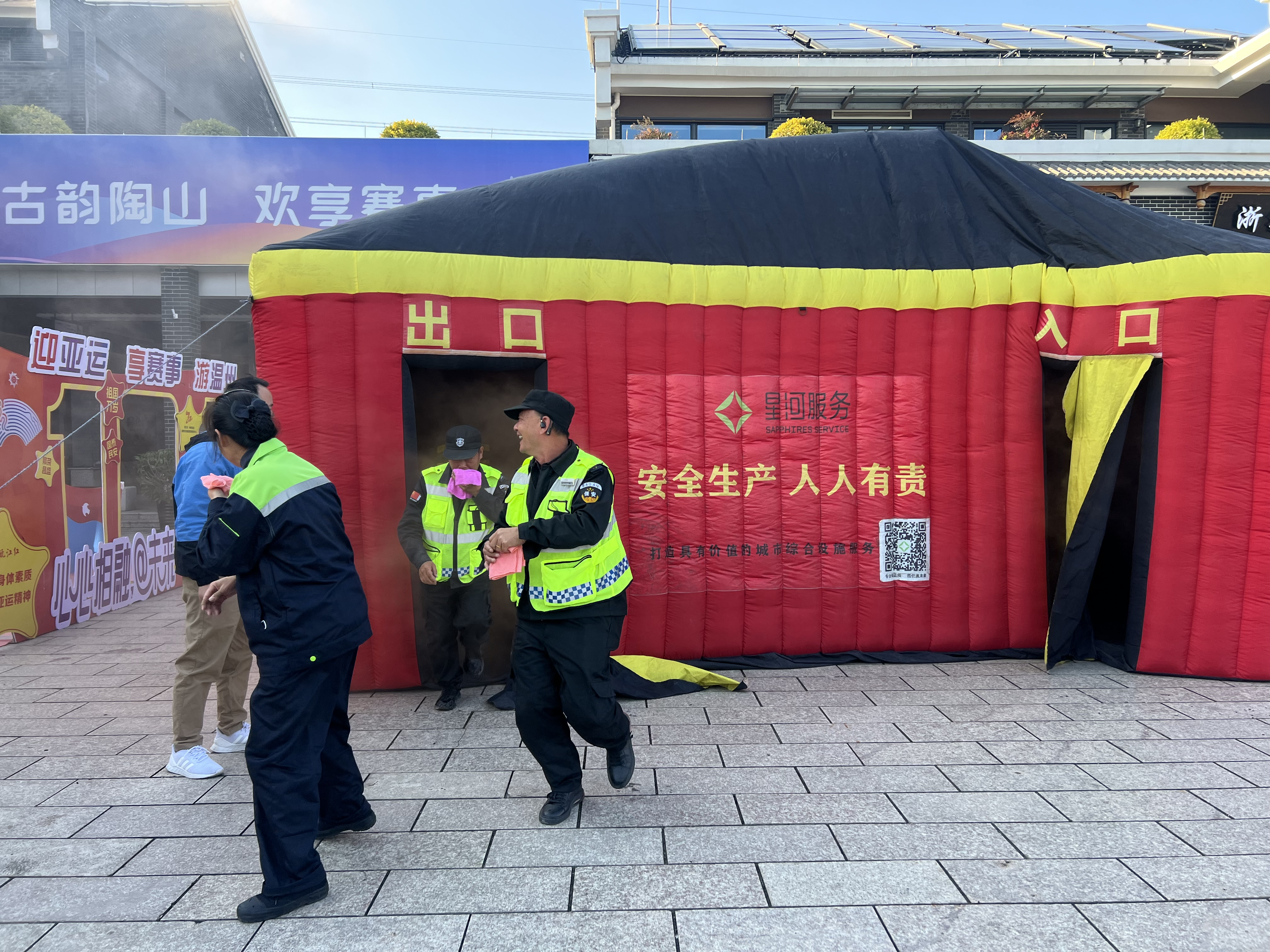 在培训老师的指导下,现场相继开展包括模拟火情、灭火扑救、火灾逃生等方面的消防演练,随后参与消防演练的人员排队参与逃生帐篷体验。“逃生帐篷”内设有隔断墙,将帐篷内空分隔成迂回曲折的走道空间,并分开设置1个进口和1个出口,进出口上设有遮光用的门帘,具有封闭、黑暗、浓烟等特点让人有身临其境之感。在烟雾缭绕的帐篷内模拟感受火灾发生时的现场状态,按照帐篷内的标识找到正确的道路,最后顺利地从出口“逃生”。本次活动吸引过往司乘人员驻足观看学习,切实增强群众的消防安全意识,提高消防安全防范技能。