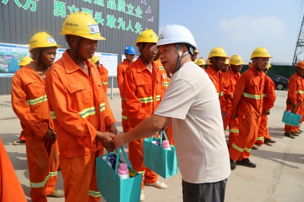 张少颖一行向高温酷暑中的广大建设者表示衷心感谢,并叮嘱大家要注意防暑降温,规范作业流程,确保自身和项目设施绝对安全。他指出,一要严格执行错峰作业制度,合理安排施工进度和工作时间,坚决杜绝为抢工期而突破健康防线的行为;二要做好防暑物资保障,确保防暑用品数量充足,切实落实防暑降温各项措施;三要持续提升安全生产管理水平,利用好班前会等形式加强健康提醒,将关怀举措转化为项目建设的坚实保障。
