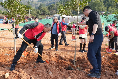 活动尾声,新栽的树苗与隧道口“绿水青山党旗红”标语相映成辉,勾勒出交通建设与生态保护的和谐画卷。
