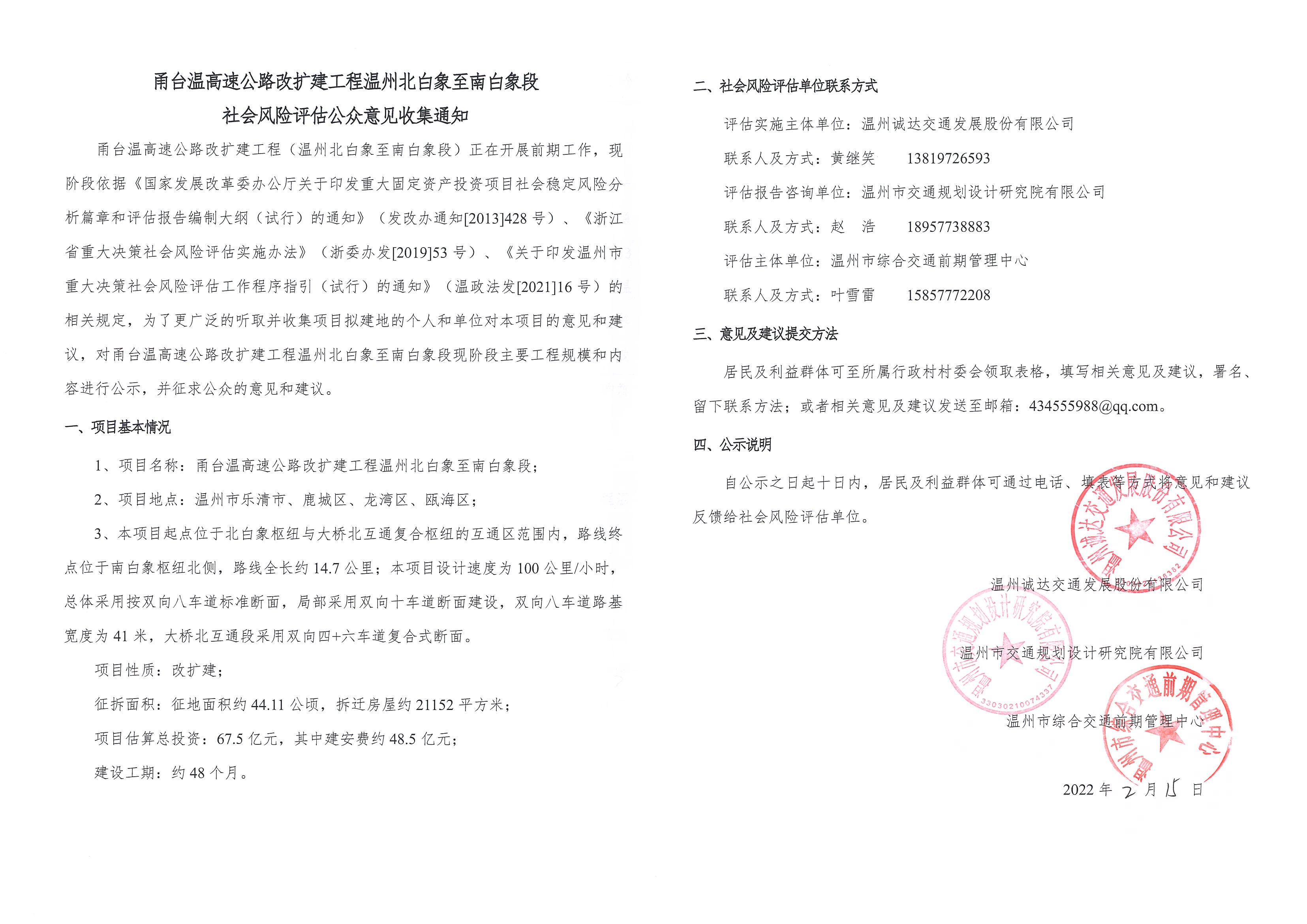甬台温高速公路改扩建工程 (温州湖雾镇至南塘枢纽、乐清枢纽至北白象段) 社会风险评估公众意见收集通知