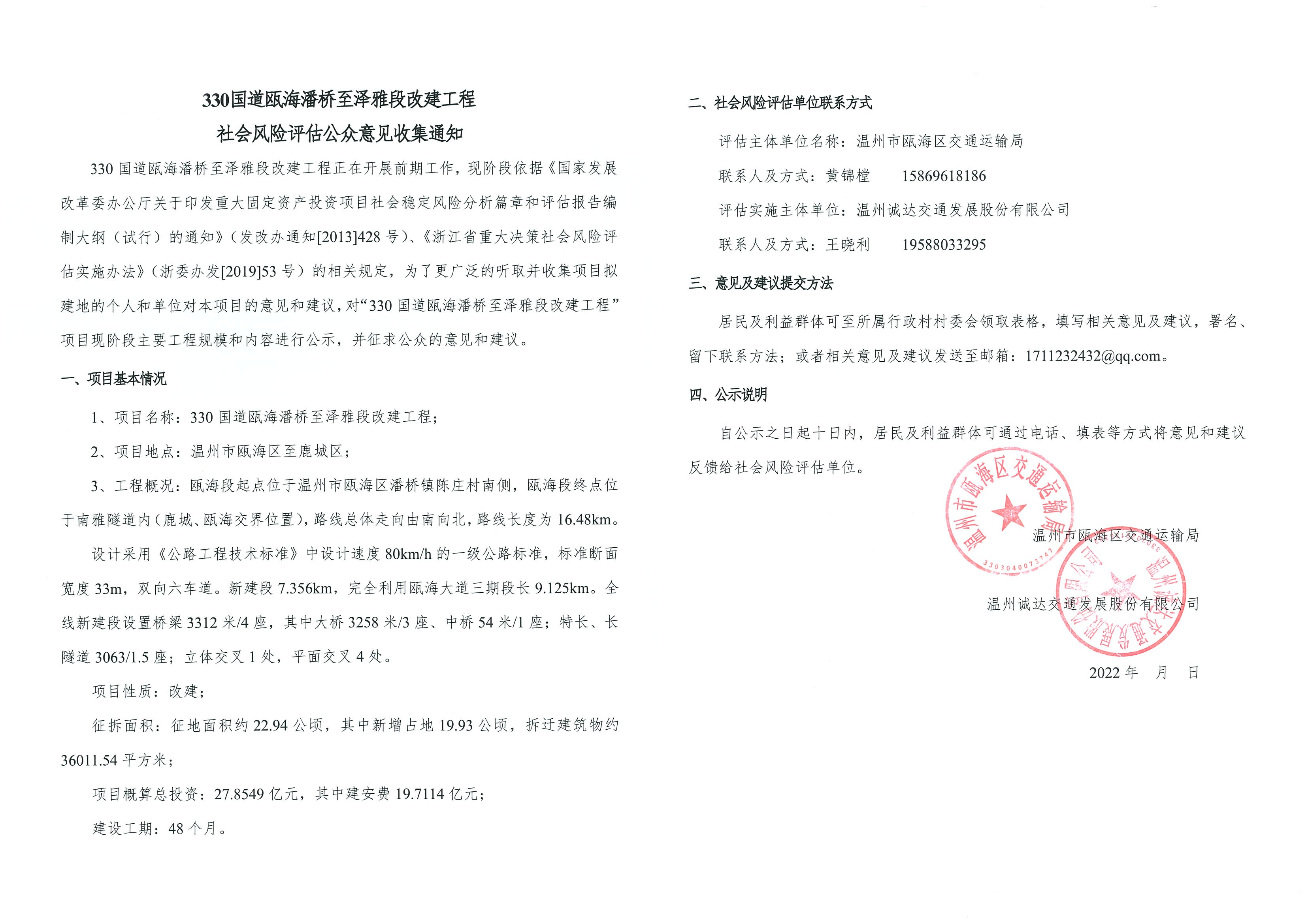 330国道瓯海潘桥至泽雅段改建工程社会风险评估公众意见收集通知